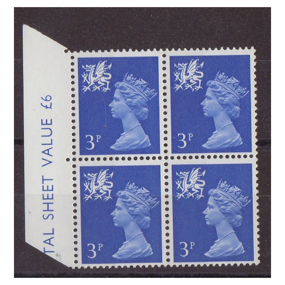 GB 1971 Wales 3p, broad band left, block of 4, u/m. SGW14var