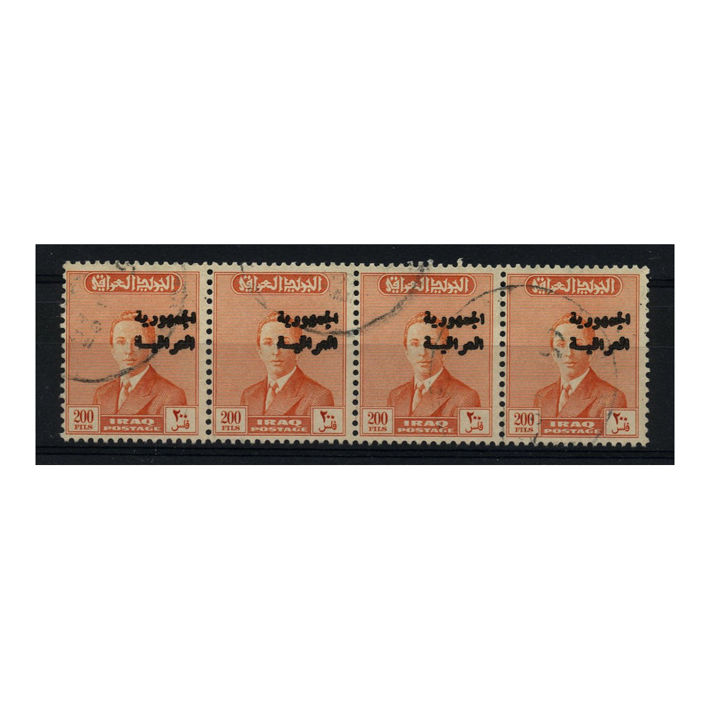Iraq 1958-60 200f Republic ovpt, horiz strip of 4, fine cds used. SG442